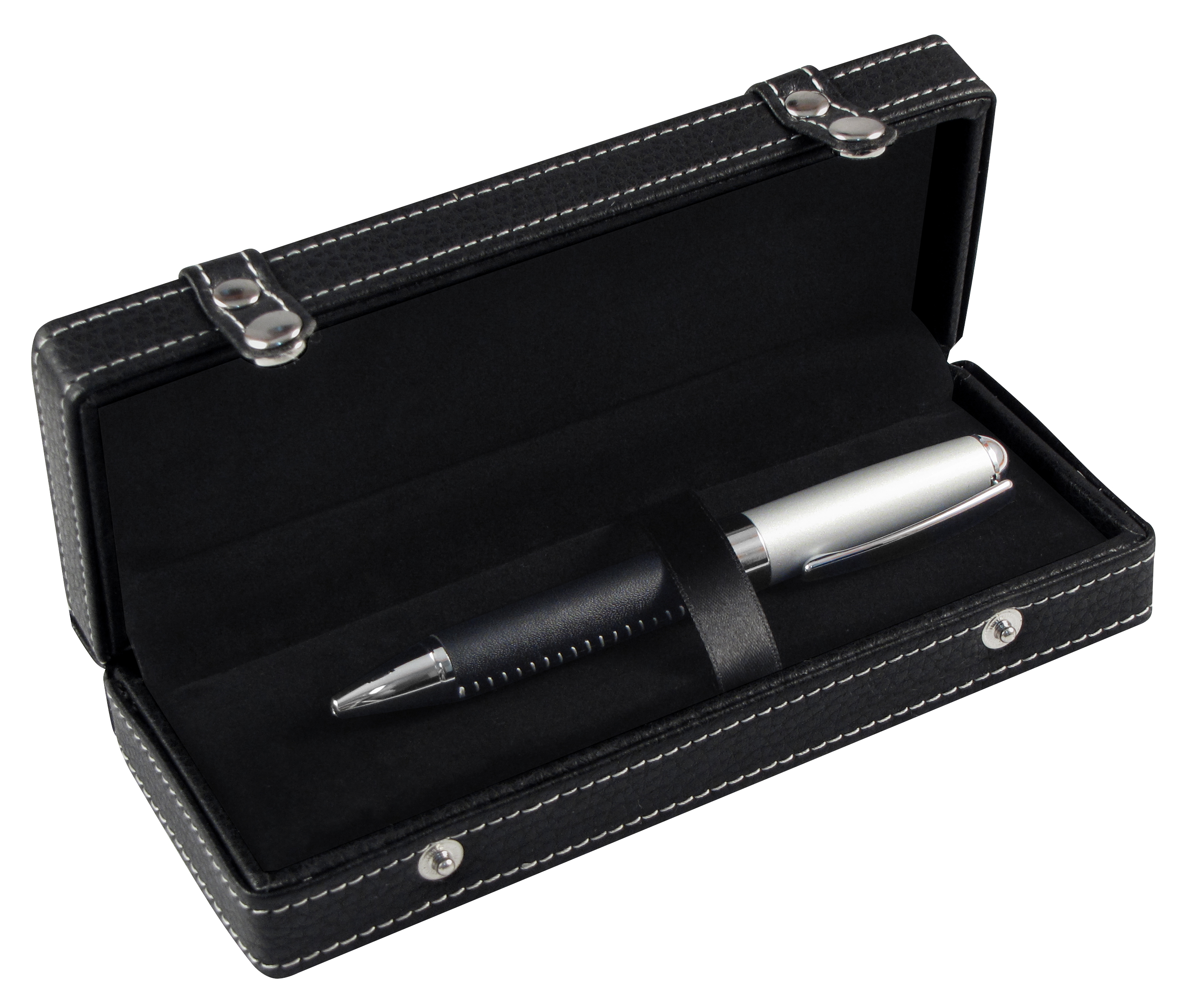 Bolígrafo metálico Executive, en PU negro + acero inoxidable, terminales cromados. Refill Metálico Parker type. Presentación en fino estuche simil cuero negro con acolchado, sistema de cierre broches metálicos.
