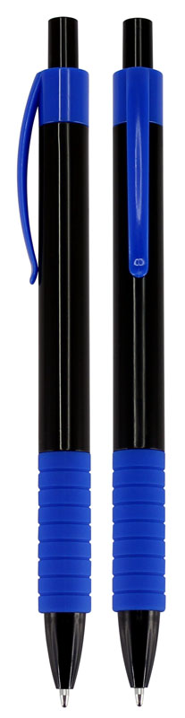 Bolígrafo New Orleans cuerpo negro sólido y grip de goma de color. Escritura azul.