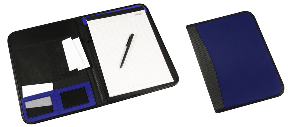 Carpeta de PU/PVC. En el interior incluye Block de 30 hojas lineadas tamaño A4, Bolígrafo negro a pasta, Bolsillos para documentos tamaño A4, Bolsillos de tela TNT y Compartimentos para Tarjetas.