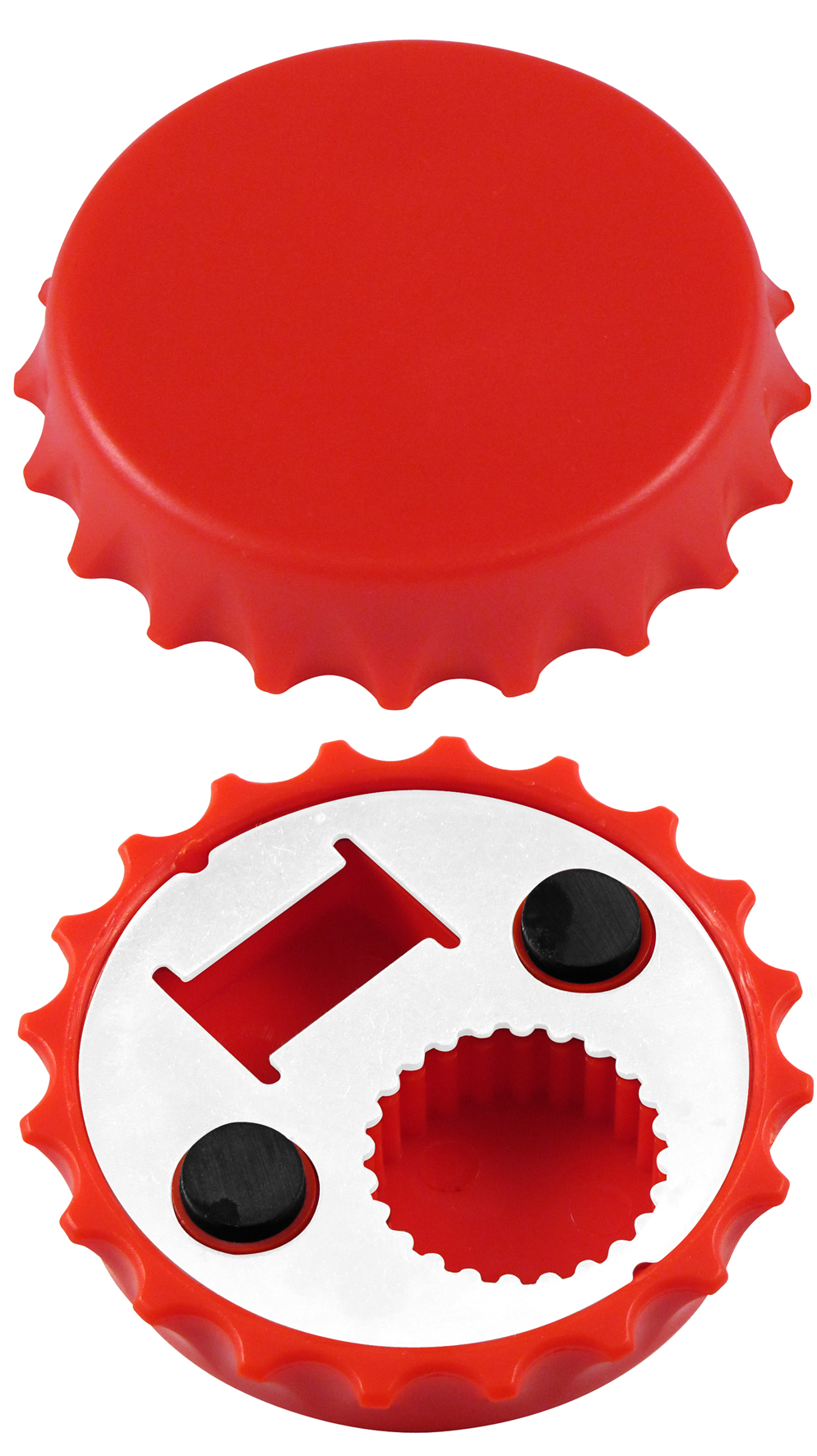 Destapador y Abridor de tapas twist-off, con forma de tapa de botella. Imantado para refigerador.