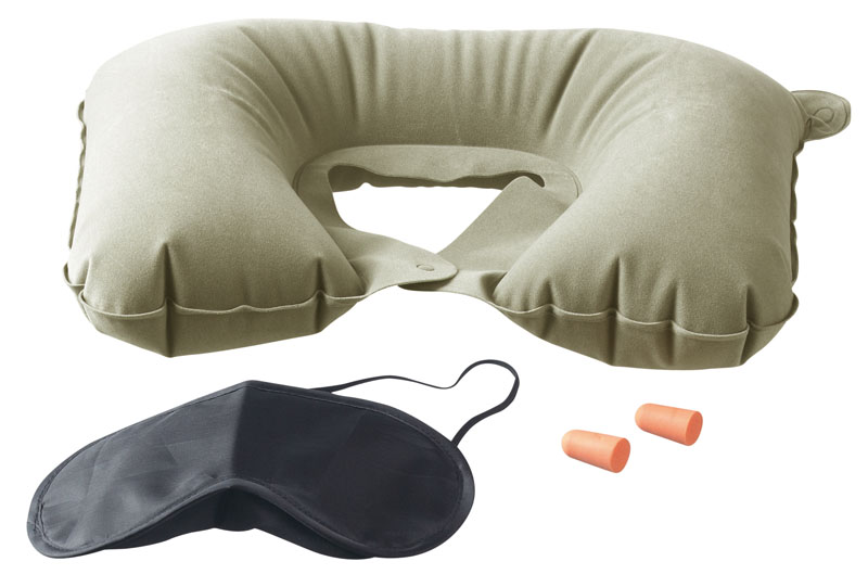 Kit de Descanso para Viajes. Incluye Almohada inflable cervical en tela aterciopelada, antifaz de microfibra y tapones de EVA para los oídos. Presentación en estuche aterciopelado.