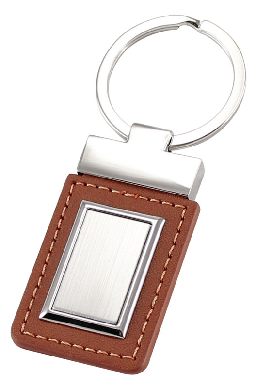 Llavero de Cuero Café con ventana rectangular metálica. Presentación en estuche laminado café con cuna aterciopelada.