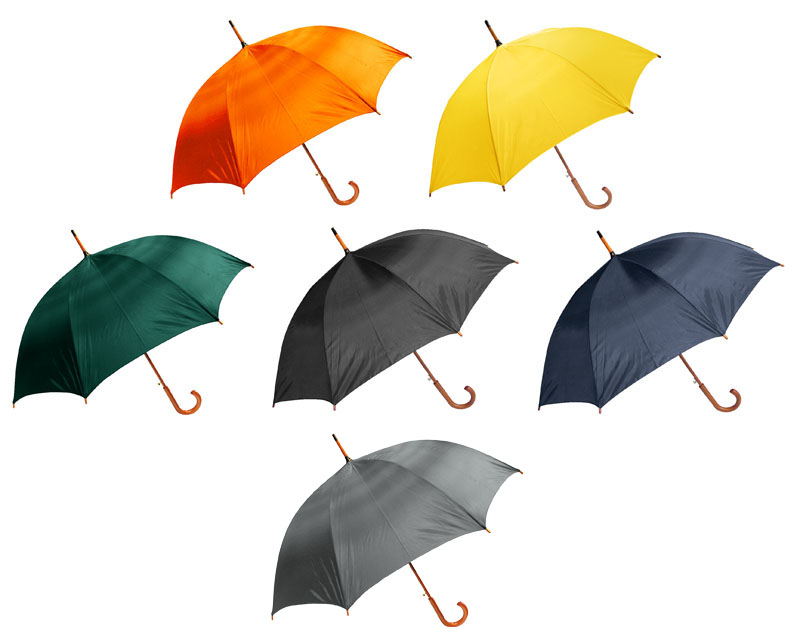 Paraguas ejecutivo con cuerpo y mango curvo de madera barnizada. Varas reforzadas de fibra de vidrio, sistema de apertura automático, 8 cascos tela Nylon 190T.
