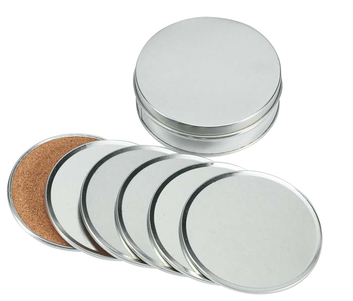 Set de 6 posavasos redondos de Aluminio con reverso antideslizante de corcho. Presentación en estuche redondo de aluminio
