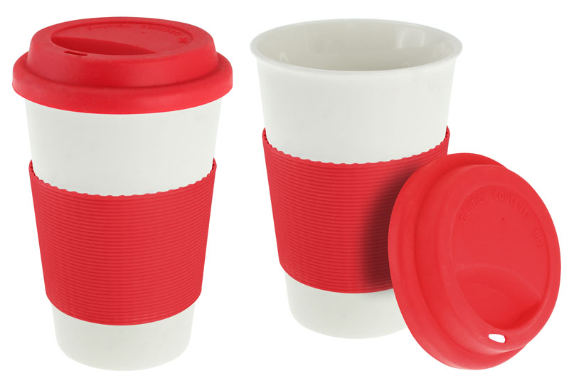 Vaso cerámico blanco de 400 ml, con tapa y grip (mango) texturado de silicona de color. Presentación en caja de cartón blanco.